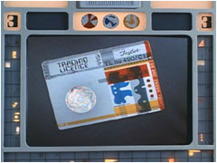Taybor mostra la sua licenza di commerciante spaziale sul video: è un tesserino di tipo decisamente terrestre, una specie di badge, scritto in inglese (!) e con i caratteri "Orbital" tipici delle scritte di Alpha stessa!!!
